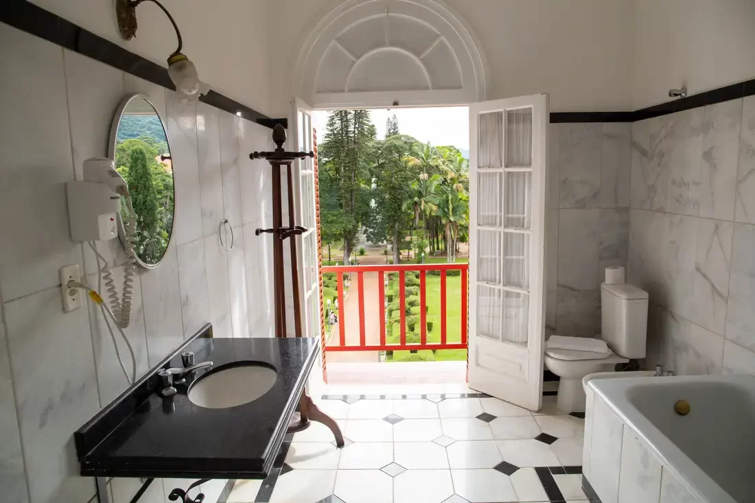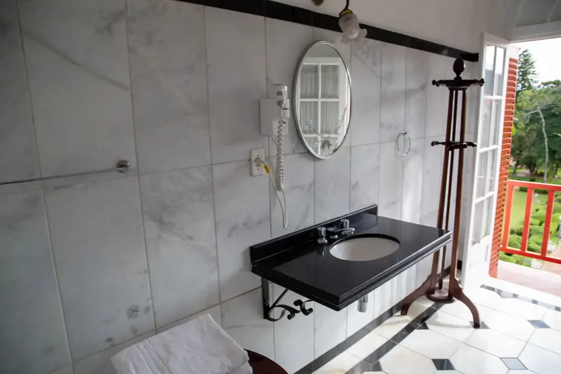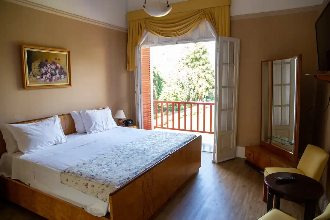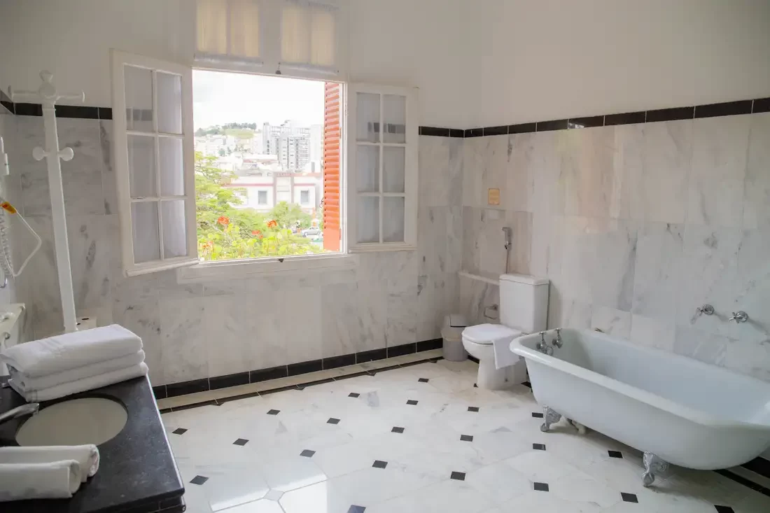 A Suíte Luxo com Banheira são para quem preza pelo conforto, com muito charme e elegância, todos com piso de madeira, antessala, varanda e pode oferecer uma vista deslumbrante para as praças do entorno do Hotel. Disponíveis somente com a opção de 1 cama de casal e equipada com TV, Wi-Fi, frigobar e banho privado com banheira de imersão e amenities.